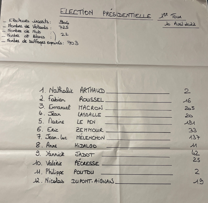 - Fabien Roussel Parti communiste français 2,28% 16 votes